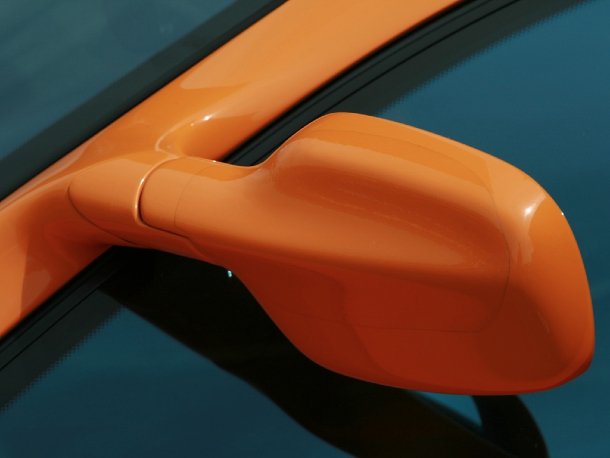 Das Interieur des Ausstellungsfahrzeugs ist mit der oben erwähnten Lightweight-Faser versehen und präsentiert sich passend zur Lackierung auch in orange. Nur ein Rundinstrument dominiert das Instrumentenpanel, daneben sitzen links und rechts Displays, die sich vom Fahrer individuell belegen lassen. Auch hier ist vieles vom Leichtbaugedanken geprägt. So bestehen zum Beispiel die Lenkstockhebel aus Aluminium und die Unterkonstruktion des Armaturenbretts aus Magnesium.
