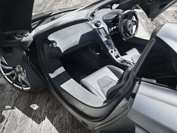 Das Interieur ist mit schwarzem Leder und Alcantara ausgekleidet, während die Dekorblenden ebenfalls mattes Sichtcarbon zeigen. Im Kontrast dazu erhielten die Lüftungsdüsen und Verstellknöpfe an der Mittelkonsole ein glänzendes Finish. Auf dem Carbon-Einstiegsbereich findet sich das McLaren Special Operations Logo und eine Metallplakette mit stilisiertem Autogramm von McLaren Designchef Frank Stephenson.