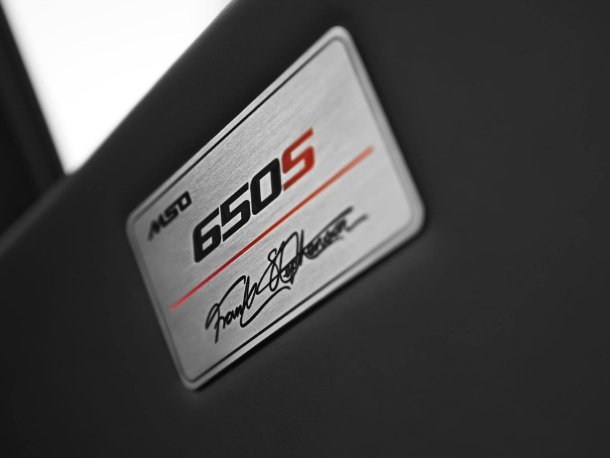 Frontsplitter, Schweller-Blades und Heckpartie präsentieren sich in mattem Sichtcarbon. Zusätzlich wurde der Diffusor deutlicher als am normalen Serien-650S ausgeformt. Die 10-speichigen Super-Lightweight-Felgen sparen vier Kilogramm ungefederte Masse ein und erhalten beim MSO-Sondermodell eine Lackierung in Palladium grau mit diamantgeschliffenen Abschnitten zwischen den Speichen.
