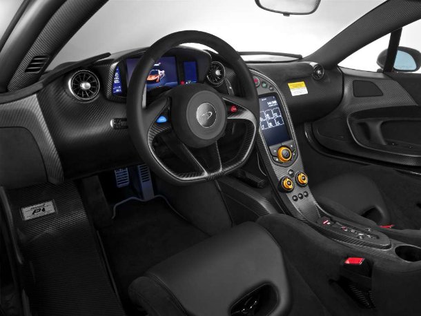 Der ebenfalls ausgestellte McLaren P1 zeigt sich im Farbton Stirling Grey metallic und erhielt einige Akzente im historischen McLaren Orange. Sowohl das Logo auf der Front, als auch die Bremssättel, die oberen Halterungen des Heckflügels und die P1-Logos an Seite und Heckpartie zeigen sich orange abgesetzt. Hinten fällt die Verwendung von Echtgold als Hitzeschild rund um das zentrale Auspuffendrohr auf – damit wird an den legendären Vorgänger F1 erinnert, bei dem ebenfalls Gold als Hitzeschutz zum Einsatz kam. Alle Gitter an Luftein- und -auslässen sind an diesem Fahrzeug silber lackiert worden, während das Interieur in schwarzem Leder und Alcantara ausgekleidet und mit Vierpunktgurten an beiden Sitzen ausgestattet wurde. Die Stellknöpfe an der Mittelkonsole greifen die Kontrastfarbe McLaren Orange auf.