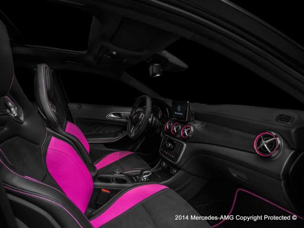 Bereits beim öffnen der Türen fallen die schwarzen Einstiegsleisten mit pink auflackiertem AMG-Schriftzug ins Auge. Auch die Ziernähte und die Einfassungen der Belüftungsdüsen tragen diesen Farbton, der sich vom ansonsten schwarz gehaltenen Interieur deutlich absetzt. Die Dekorblenden am Armaturenbrett sind in Sichtcarbon ausgeführt. Zudem wurden die seitlichen Bereiche der Sitze vorn und hinten mit pink eingefärbtem Leder bezogen.