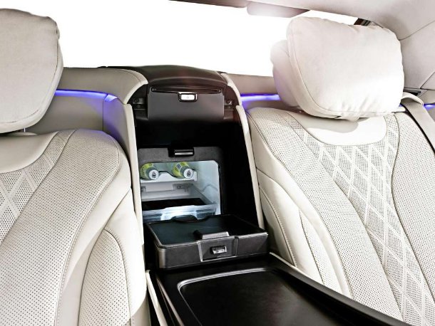 Zwischen den Fondsitzen lässt sich zudem auf Wunsch ein Kühlfach ordern.