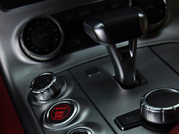 In den ersten drei Gängen erdrosselt der Drehzahlbegrenzer blitzartig den Vortrieb, wenn man nicht zackig genug an der Schaltwippe zieht. Das Getrag Getriebe reagiert erst nach merklicher Verzögerung auf Befehle. Immerhin aber vermeidet das System lästige Kickdowns, die den Rhythmus des Fahrers hintergehen könnten. Den Begriff „Zurückschalten“ verbannt der mächtige AMG ohnehin in Richtung Absurdität. Ohne Zwangsbeatmung stellt das reinrassige Hochleistungstriebwerk jederzeit Unmengen an Newtonmeter zur Verfügung.