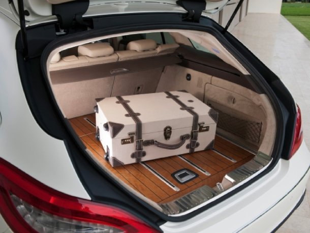 Die Karosserieform des CLS zeigt sich auch mit Kombiheck hervorragend akzentuiert und scharf geschnitten. Während die Front bis zu den vorderen Türen unverändert bleibt, zeigt sich ab hier die seitliche Fensterlinie verlängert und um ein Glaselement erweitert. Dabei bleibt die Dachhöhe jedoch unverändert und fällt in Richtung Heckklappe leicht ab. Die bis ins Dach reichende Heckklappe mit sehr schräg stehender Rückscheibe gibt den Weg zum bis zu 1.550 Liter fassenden Gepäckraum frei – wenn die Rückbank stehen bleibt, stehen 590 Liter Fassungsvermögen zur Verfügung. Größeren Einkäufen oder der Fahrt in den Urlaub steht also wenig im Wege. Der Ladeboden des Kofferraums ist gegen Aufpreis mit amerikanischem Kirsch-Holz belegt und schafft damit einen besonders edlen Eindruck. Im Holzboden sind Intarsien in dunkler Räuchereiche und gebürstete Aluminiumleisten mit rutschfester Gummioberfläche eingelassen.