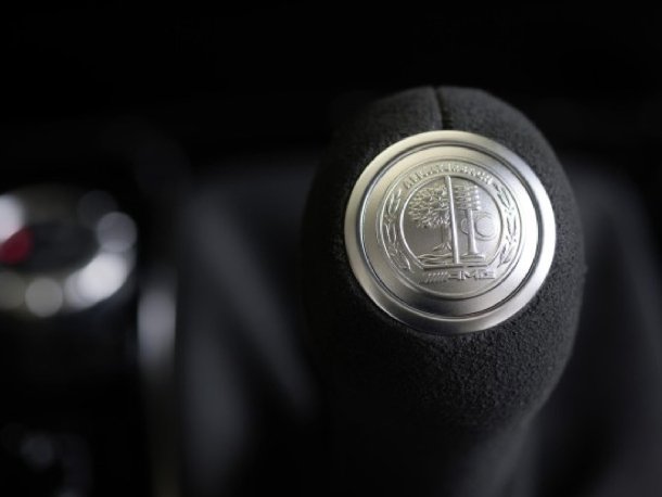 Der Alcantara-Automatikwählhebel trägt obenauf das AMG-Wappen in Aluminium.
