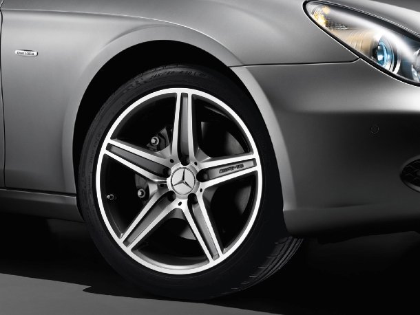 Bi-Xenon-Scheinwerfer mit dunklem Scheinwerfergehäuse, aktivem Kurvenlicht und Abbiegelichtfunktion in den Nebelscheinwerfern, Scheinwerferreinigungsanlage und dynamischer Leuchtweiten-regulierung, sowie exklusive 18-Zoll AMG -Leichtmetallräder im 5-Speichen-Design, titangrau lackiert und glanzgedreht, die mit Reifen der Größe 245/40 R18 (VA) und 275/35 R18 (HA) bestückt sind.