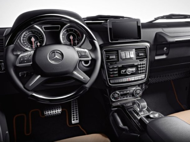 Das Interieur der G-Modelle wurde komplett überarbeitet und mit einem neu gestalteten Armaturenbrett versehen. Dabei wurden Modell-typische Elemente wie der Beifahrerhaltegriff über dem Handschuhfach beibehalten. Die beiden Rundinstrumente für Tacho und Drehzahlmesser verbergen sich nun in tiefen Tuben, zwischen denen ein Farbdisplay über wichtige Fahrzeugfunktionen informiert. Mittig über der Mittelkonsole wurde ein großes Farbdisplay angebracht, das zum Comand Online-System gehört. Neben einem DVD-Wechsler bietet dieses System eine Navi-Funktion mit Offroadprogramm, Internetzugang, die Linguatronic-Sprachsteuerung und ein Bluetooth-Einbindung der momentan gängigen Mobiltelefone. Unterhalb des Displays wurden die drei Schalter für die Differentialsperren in silber hervorgehoben, um den Offroad-Anspruch der G-Klasse zu unterstreichen. Immerhin gibt es weltweit nur wenige vergleichbare Fahrzeuge, mit denen man ab Werk im harten Gelände weiterkommt, als mit einem G.