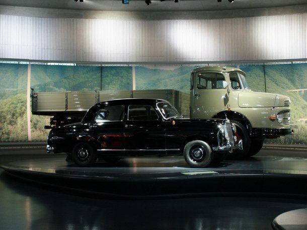 Ein paar Meter weiter steht man vor der „Standuhr“, einem Einzylinder-Viertaktmotor, den Gottlieb Daimler sich patentieren ließ. Dahinter drehen sich die ersten beiden Automobile, das Dreirad von Carl Benz und die Motorkutsche von Daimler auf Drehscheiben im Rampenlicht. Daimler erfand übrigens bereits vorher das Motorrad, als er Anfang 1885 seinen „Reitwagen“ baute. Zwar besitzt das Fahrzeug seitliche Stützräder, aber dennoch kann man bereits die Grundzüge der bis heute gängigen Motorradformen erkennen. Die Erfindung des Lastkraftwagens darf hingegen der Firma Benz zugetragen werden. Im Stuttgarter Museum steht ein schönes Originalfahrzeug.