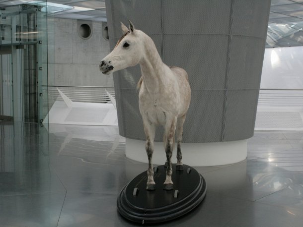 Der Rundgang durch die Ausstellung beginnt mit einer Fahrstuhlfahrt in rund 50 Meter Höhe. Man durchschreitet das Museum von oben nach unten auf einer so genannten „Doppel-Helix“, die an den Aufbau unserer DNA erinnern soll. Für Medizin-Laien: es gibt zwei ineinander verschlungene Wege nach unten, zum Einen den durch die zeitlich geordnete Ausstellung und zum Anderen den durch die Themenschwerpunkt-Räume. Beide beginnen nach der Aufzugsfahrt vor einem ausgestopften Pferd. Was macht ein solches Tier in einem Automuseum, noch dazu untermalt durch Pferdegetrappel über Deckenlautsprecher? Die heutige Marke Mercedes-Benz beinhaltet den Nachnamen des Erfinders des Automobils, Carl Benz. Heute gehört die Marke zum Daimler-Konzern, der ebenfalls einen wichtigen Nachnamen beinhaltet. Gottlieb Daimler forschte unabhängig von Carl Benz am selben Thema, war jedoch den entscheidenden Hauch zu langsam bei der Patenteinreichung. In der Zeit, als die beiden an Motoren und deren Einsatzzwecken forschten und experimentierten, gab es auf den Straßen in aller Welt lediglich Pferde- und Ochsengespanne. Heute schwer vorstellbar.