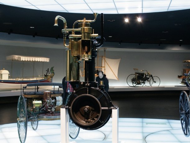 Der Rundgang durch die Ausstellung beginnt mit einer Fahrstuhlfahrt in rund 50 Meter Höhe. Man durchschreitet das Museum von oben nach unten auf einer so genannten „Doppel-Helix“, die an den Aufbau unserer DNA erinnern soll. Für Medizin-Laien: es gibt zwei ineinander verschlungene Wege nach unten, zum Einen den durch die zeitlich geordnete Ausstellung und zum Anderen den durch die Themenschwerpunkt-Räume. Beide beginnen nach der Aufzugsfahrt vor einem ausgestopften Pferd. Was macht ein solches Tier in einem Automuseum, noch dazu untermalt durch Pferdegetrappel über Deckenlautsprecher? Die heutige Marke Mercedes-Benz beinhaltet den Nachnamen des Erfinders des Automobils, Carl Benz. Heute gehört die Marke zum Daimler-Konzern, der ebenfalls einen wichtigen Nachnamen beinhaltet. Gottlieb Daimler forschte unabhängig von Carl Benz am selben Thema, war jedoch den entscheidenden Hauch zu langsam bei der Patenteinreichung. In der Zeit, als die beiden an Motoren und deren Einsatzzwecken forschten und experimentierten, gab es auf den Straßen in aller Welt lediglich Pferde- und Ochsengespanne. Heute schwer vorstellbar.