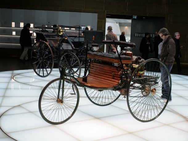 Der Rundgang durch die Ausstellung beginnt mit einer Fahrstuhlfahrt in rund 50 Meter Höhe. Man durchschreitet das Museum von oben nach unten auf einer so genannten „Doppel-Helix“, die an den Aufbau unserer DNA erinnern soll. Für Medizin-Laien: es gibt zwei ineinander verschlungene Wege nach unten, zum Einen den durch die zeitlich geordnete Ausstellung und zum Anderen den durch die Themenschwerpunkt-Räume. Beide beginnen nach der Aufzugsfahrt vor einem ausgestopften Pferd. Was macht ein solches Tier in einem Automuseum, noch dazu untermalt durch Pferdegetrappel über Deckenlautsprecher? Die heutige Marke Mercedes-Benz beinhaltet den Nachnamen des Erfinders des Automobils, Carl Benz. Heute gehört die Marke zum Daimler-Konzern, der ebenfalls einen wichtigen Nachnamen beinhaltet. Gottlieb Daimler forschte unabhängig von Carl Benz am selben Thema, war jedoch den entscheidenden Hauch zu langsam bei der Patenteinreichung. In der Zeit, als die beiden an Motoren und deren Einsatzzwecken forschten und experimentierten, gab es auf den Straßen in aller Welt lediglich Pferde- und Ochsengespanne. Heute schwer vorstellbar.