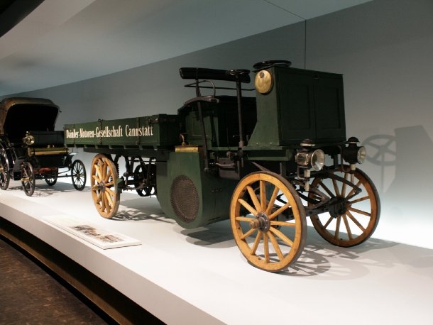 Ein paar Meter weiter steht man vor der „Standuhr“, einem Einzylinder-Viertaktmotor, den Gottlieb Daimler sich patentieren ließ. Dahinter drehen sich die ersten beiden Automobile, das Dreirad von Carl Benz und die Motorkutsche von Daimler auf Drehscheiben im Rampenlicht. Daimler erfand übrigens bereits vorher das Motorrad, als er Anfang 1885 seinen „Reitwagen“ baute. Zwar besitzt das Fahrzeug seitliche Stützräder, aber dennoch kann man bereits die Grundzüge der bis heute gängigen Motorradformen erkennen. Die Erfindung des Lastkraftwagens darf hingegen der Firma Benz zugetragen werden. Im Stuttgarter Museum steht ein schönes Originalfahrzeug.