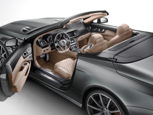 Zur umfangreichen Sonderausstattung des Mercedes-Benz SL 65 AMG 45th Anniversary Edition zählen der Airscarf Nackenföhn, ein aktiver Park-Assistent mit Parktronic, aktive Multikontursitze, die AMG Performance Bremsanlage mit Carbon-Ceramic-Scheiben, eine Bang & Olufsen BeoSound Musikanlage in Verbindung mit Comand Online und sechsfach DVD-Wechsler, das Fahrassistenz-Paket plus mit Distronic Plus, Bremsassistent Plus, Pre-Safe Bremse, aktivem Spurhalte- und aktivem Totwinkelassistent, das Intelligent Light System, Keyless-Go, das Panorama-Verdeck mit abdunkelbarer Magic Sky Control, sowie ein elektrisch aus- und einfahrbares Windschott. Zu den Händlern rollen die 45 Exemplare des SL 65 AMG 45th Anniversary Edition ab September, Preise sind noch nicht bekannt.