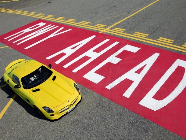 Wenn man den geflügelten Elektro-AMG auf der Strasse erkennen möchte, muss man höllisch auf der Hut sein. Ehe man ihn wahrnimmt, ist er auch schon fast lautlos an einem vorbei geschossen – man erlebt ihn ja nun (leider) nicht mehr mit Gebrüll. Aber dafür hat der erste Prototyp des Mercedes-Benz SLS AMG E-Cell eine umso auffälligere Farbe: „Lumilectric Magno“ – ein fluoreszierender, neongelber Lack macht ihn schon von weitem sichtbar.