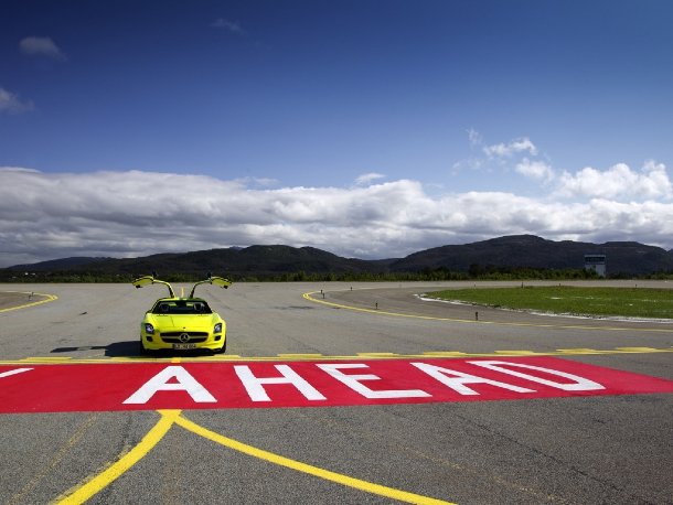 AMG stellt sein aktuellstes Entwicklungsprojekt in Norwegen vor, wo schon fleißig Ökostrom eingesammelt wird. Im Mercedes-Benz SLS AMG E-Cell, der Ende 2012 serienreif sein wird, steckt ein echter Supersportler: Mit 392 kW bei maximalen 880 Nm Drehmoment beschleunigen 4 Elektromotoren diesen geflügelten Allradler in nur 4 Sekunden von 0 auf 100 km/h – und das ohne Verzögerung! Wo ein Motor sein Drehmoment erst aufbaut, lassen seine vier Synchron-Elektromotoren ihrer Kraft sofort freien Lauf und schießen den Sportler ab, wie einen Torpedo.