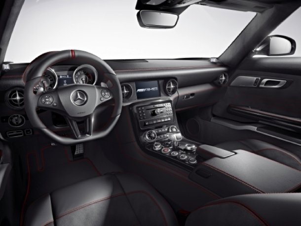 Innen präsentiert sich der SLS GT in schwarz mit roten Akzenten.