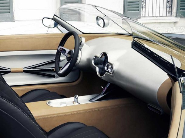 Die Italiener nahmen die Aufgabe gern an und erstellten einen puristisch-offenen Roadster mit flacher Windschutzscheibe und gänzlich ohne sonstigen Wetterschutz. Während an der Front durch die Form von runden Scheinwerfern und hexagonalem Grill noch typische Mini-Merkmale aufgegriffen wurden, zeigen sich das Profil und Heckpartie betont eigenständig. Die Formensprache ist dabei auf das Wesentliche konzentriert, ohne überflüssige Schnörkel und Sicken. Selbst auf klassische Türgriffe wurde zugunsten einer möglichst glatten Seitenfläche verzichtet. Die Pforten öffnen stattdessen über Tastflächen auf Höhe der Sitze.