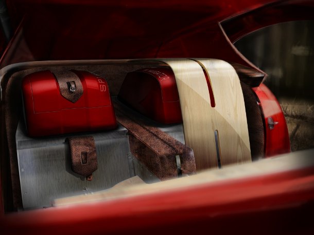 Hinter den Sitzen finden sich zwei passgenaue Koffer, die von Ledergurten an ihrem Platz gehalten werden.