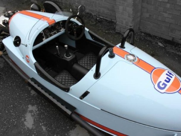 Morgan hat mit dem Threewheeler unbewusst ein Erfolgsmodell ins Programm aufgenommen. Wobei, streng genommen sollte man sagen: Wiederaufgenommen. Nachdem bereits zwischen 1909 und 1953 mehr als 30.000 Exemplare des Ur-Threewheelers verkauft werden konnten, zeigt sich mit der Neuauflage, dass der Reiz eines solch kompromisslosen Fahrzeugs nicht nachgelassen hat. Die Produktionskapazitäten reichen aktuell nicht aus, um die Bestellungen schnell genug abarbeiten zu können. Trotzdem bringen die Briten nun ein exklusives Sondermodell des Threewheeler auf den Markt, mit dem man an das aktuelle LMP-Rennfahrzeug erinnern möchte: Die Gulf Edition.