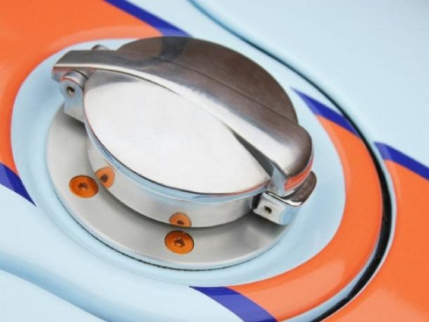 Das legendäre Farbbild aus hellblauer Grundfarbe mit orangefarbenen Streifen gehört seit den 1960er Jahren unauslöschlich zu den bekanntesten Rennlackierungen der Welt. Auf legendären Rennwagen wie dem Ford GT40, dem Porsche 917 oder in der Neuzeit dem Audi R8, dem Aston Martin DBR9 oder jetzt dem Morgan Nissan LMP zeigt sich immer wieder auf’s Neue, dass die Gulf-Farben einfach jedes sportliche Auto schmücken können. Und so verwundert es nicht, dass auch der Morgan Threewheeler in dieser Zweifarblackierung hervorragend aussieht. Aufgrund der Karosseriegröße könnte man meinen, dass für farbliche Spielereien kaum Platz ist, doch nachdem bereits viele Kunden das optionale Kampf-Flieger-Design für ihr britisches Dreirad gewählt haben, ist auch für die Gulf Oil-Farben und -Logos genügend Raum, um zur Geltung zu kommen.