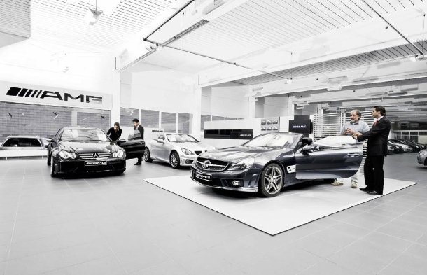 Die neu gestalteten Verkaufsräume der AMG Performance Center zeichnen sich durch einen einheitlichen und eigenständigen AMG Markenauftritt aus. Hochwertige Materialien, exklusives Mobiliar und die AMG-typische Farbwelt schaffen eine exquisite Beratungs-Atmosphäre. Eine überdimensionale AMG Motorplakette vermittelt dem Besucher die Philosophie von „One Man – One Engine“, der Ferti-gung leistungsstarker AMG Motoren von Hand. Auch die Individualisierungs-möglichkeiten des designo-Programms finden sich in Form von Farbtafeln und echten Ledermustern in den AMG Performance Centern wieder.