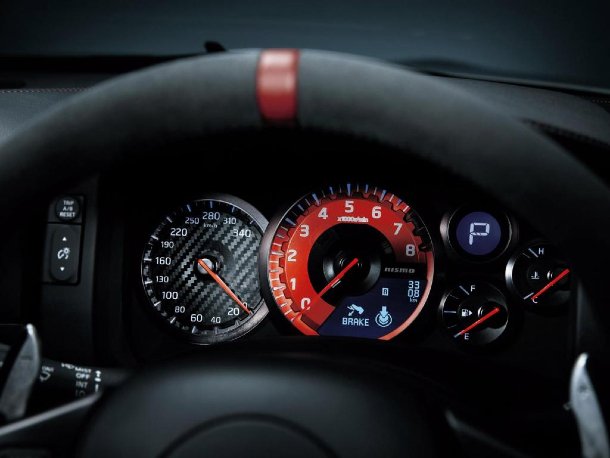 Dieses Farbspiel setzt sich im gesamten Interieur fort, auch bei den speziellen Tachografiken im Nismo-Design.
