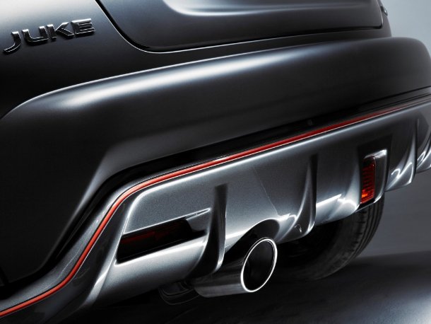 Die Karosserie des Juke Nismo RS präsentiert sich wahlweise in Perlweiß, Schwarz metallic oder mattem Silbergrau. Rote Akzente an den Außenspiegeln, Schwellern und Schürzen schaffen optische Unterscheidungsmerkmale zu den normalen Juke-Modellen. Dazu findet sich vorn eine Schürze mit größeren Lufteinlässen und LED-Tagfahrleuchten. Diese ist designerisch über die verbreiterten Radhäuser und die sportlicher gestalteten Schwellerleisten mit der Heckschürze verbunden, die in ihrem angedeuteten Diffusor das runde Auspuffendrohr integriert. Der große Dachspoiler sorgt für eine bessere Aerodynamik. 18 Zoll große Leichtmetallräder mit 10 Speichen verbergen die bereits beschriebene Bremsanlage, die nun rote Bremssättel trägt.