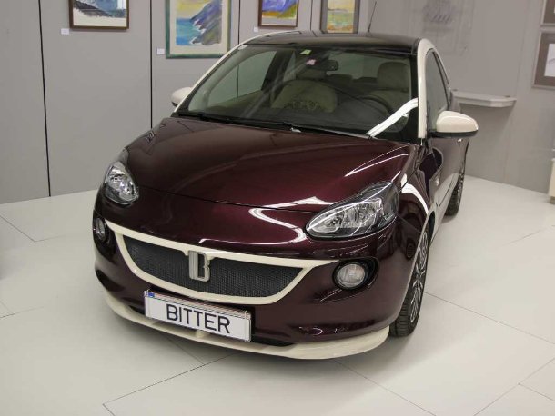 Auf der jüngst zu Ende gegangenen Techno Classica zeigte der in Schwelm und Wien beheimatete Autodidakt als Messepremiere sein Individualisierungsprogramm für den Cityflitzer Opel Adam. Auch hier gilt das Hauptaugenmerk dem Innenraum, während die Karosserie lediglich neue, passgenaue Schürzen an Front und Heck und einen Dachspoiler erhält. Innen hingegen wurden die allermeisten Plastikteile rausgeschmissen und am Präsentationsfahrzeug durch aufwändig verarbeitete Dekorteile mit Brokatbezug ersetzt. Zusätzlich ließ Bitter die Einfassung rund um den Schalthebel mit Blattgold veredeln. Die Sitzaußenbahnen, das Armaturenbrett, die Türtafeln und das Lenkrad sind mit feinem Nappaleder in hellem Beige und dunklem Burgunderrot bezogen und nehmen somit die Außenfarben wieder auf.