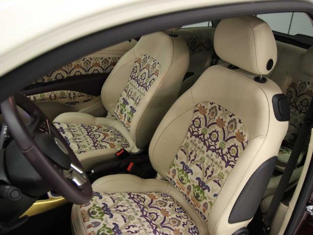 Sitze, Türtafeln und Armaturenbrett des Ausstellungsfahrzeugs erhielten Bezüge in Nappaleder und Brokat-Stoff. Die Konsole rund um den Schalthebel zeigt Blattgold.