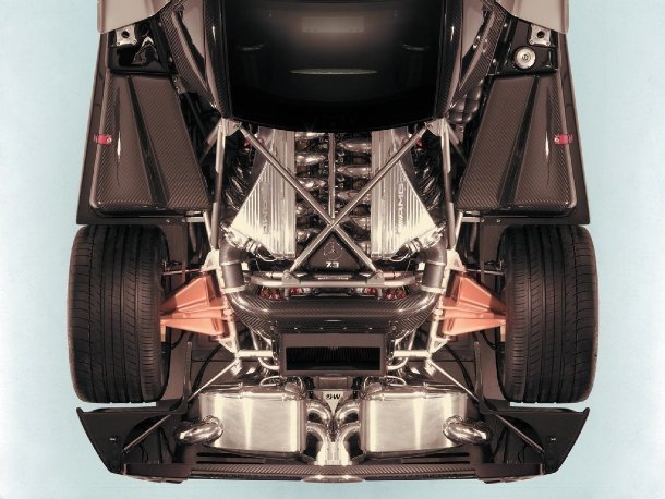 Typisch für wahre Supersportwagen sitzt der V12 exakt in der Mitte des Fahrzeugs, zwischen den Achsen und hinter der Besatzung. Von anfangs knapp 500 PS hat sich die Leistungsausbeute bis heute auf rund 700 PS gesteigert, die in Form von blauem Rauch die riesigen Hinterräder bei (un)sachgemäßem Gebrauch des Gaspedals aufschnupfen. Dabei geben sie durch vier mittig angeordnete Auspuffendrohre den Takt der Herzfrequenz wieder, die beim Fahrer gerade anliegt. Wenn Sie auf betörenden Rennwagensound für die Straße stehen, sollten Sie vielleicht mal einen Zonda zur Probe anhören. Wer dann noch Bilder eines Pagani-Motorraums sieht, weiß, dass man die hässlichen Plastikabdeckungen bei anderen Herstellern eigentlich nicht hinnehmen sollte – es geht eben auch deutlich schöner.