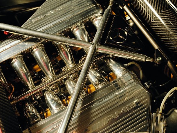 Ein wichtiger Bestandteil dabei ist natürlich die Antriebseinheit. Viele Kleinserienhersteller würden hier einfach irgendwas aus der Großserie nehmen, eventuell noch ihren Namen auf die Kunststoffabdeckung überm Motorblock kleben und fertig wäre die Laube. Nicht so Pagani.