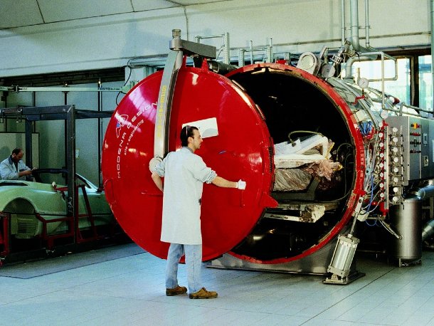 Dies ist nur mit Hilfe von so genannten Autoklaven möglich. In diesen großen Öfen werden mittels Hitze und einem Vakuum die Luft und letzte Flüssigkeitsreserven aus dem Werkstoff gepresst und dieser dadurch wahnsinnig fest und stabil.