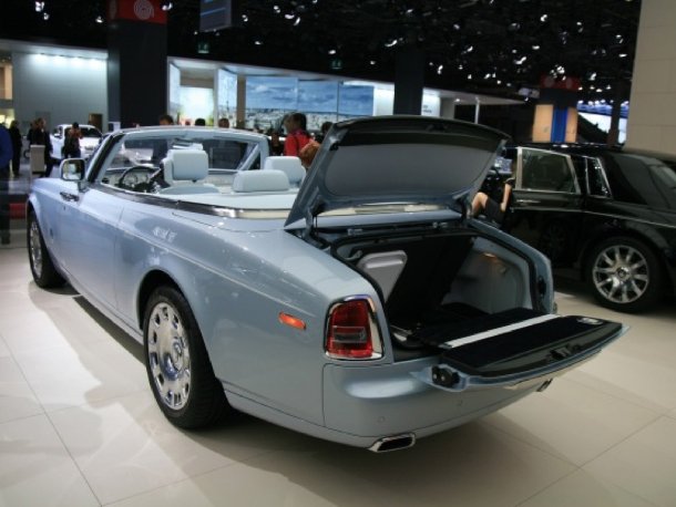 Selbstverständlich zeigte die Bespoke-Abteilung von Rolls-Royce zusätzlich auch exklusive Einbauten wie einen Champagner-Kühler im Kofferraum dieses Phantom Drophead Coupé.