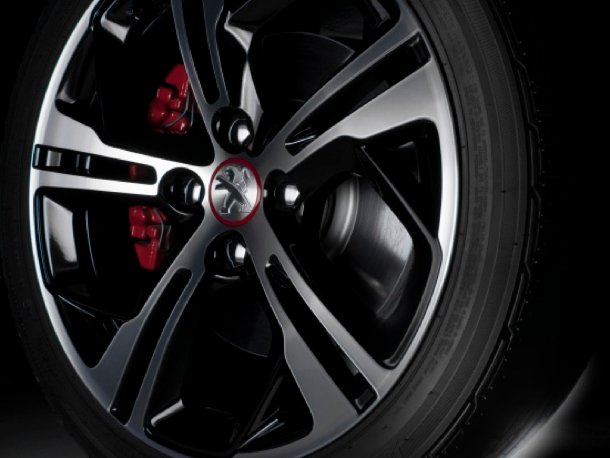 Die Felgen im Carbone-Design sind dem 208 GTi vorbehalten. Beim Sondermodell haben sie rot eingefasste Nabendeckel. Dahinter befinden sich innenbelüftete Bremsscheiben mit rot lackierten Sätteln.