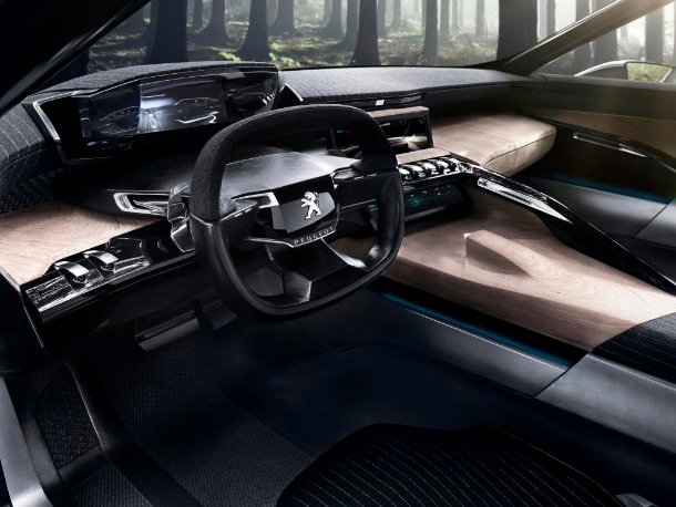 Auch im Interieur gibt es überraschende Materialien zu finden. So zeigen sich am Armaturenbrett, den Türpaneelen und der Mitteltunnelverkleidung großflächige Holzverkleidungen. Dieses „Newspaper Wood“ wird aus recycleten Wirtschaftszeitungen hergestellt und erhält dadurch seine lachsfarbene Beschaffenheit. Auf den Sitzen, dem oberen Teil des Armaturenbretts, dem Dachhimmel und den Seitenverkleidungen findet sich ein melierter Stoff auf Wollbasis. Zwischen Stoff und Holz wurde in den Türverkleidungen ein per 3D-Drucker hergestelltes Brückenmodul integriert, in dem sich die Lautsprecher des Hifi-Systems verbergen. Das Leder auf den Sitzseitenwangen weist kleine Fehler wie Narben oder Insektenstiche auf, die üblicherweise nicht im Interieursbereich bei Automobilen zu finden sind. Peugeot möchte auf diese Weise einmal die natürliche Seite von Leder, abseits der Perfektion aufzeigen.