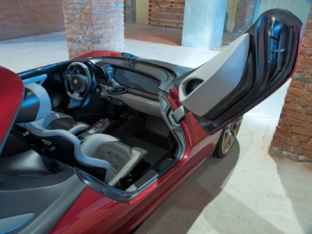 Im vordersten Bereich der Flügeltürchen ist Platz für speziell gestaltete Helme. Durch den Wegfall der Dachkonstruktion und eine Kohlefaser-Karosserie wiegt der Sergio 150 kg weniger als der 458 Spider.