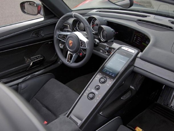 Im Innenraum setzt man bei Porsche auf ein klar definiertes Bediensystem bei dem der Fahrer im Mittelpunkt steht. Drei große Rundinstrumente hinter dem Multifunktionslenkrad sorgen dafür, dass die wichtigsten Fahrinformationen immer im Blick sind. Rund um das Lenkrad wurden alle wesentlichen Bedienelemente angebracht, wobei auf dem Lenkrad selbst die fünf Fahrmodi „E-Power“, „Hybrid“, „Sport-Hybrid“, „Race-Hybrid“ und „Hot Lap“ über den sogenannten Map-Schalter angewählt werden können. Während im „E-Power“-Modus das Erlebnis des lautlosen Fahrens bis zu einer Geschwindigkeit von 150 km/h, bei einer Beschleunigung aus dem Stand auf Tempo 100 in unter 7 Sekunden und einer Maximalreichweite von 30 Kilometern hervorgehoben werden, stehen am anderen Ende des Schalters im „Race-Hybrid“-Modus die komplette Leistung der drei Antriebe zur Verfügung, um die volle Performance des 918 Spyder zu erleben. Mittig auf dem Map-Drehschalter ist der Druckknopf für den „Hot Lap“-Modus, durch den die Traktionsbatterie am Leistungslimit genutzt wird und für einige schnelle Rennstreckenrunden (Anzahl je nach Rundenlänge) die gesamte Energie der Batterie aufgebraucht wird.