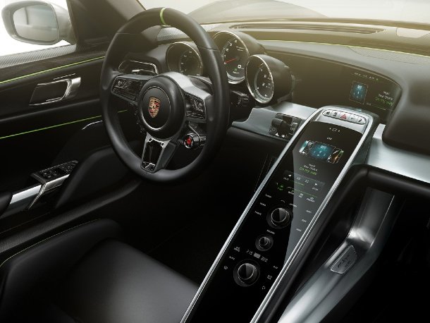 Wie schon im Carrera GT steigt die Mittelkonsole schräg an, ist im 918 jedoch deutlich fortschrittlicher gestaltet.