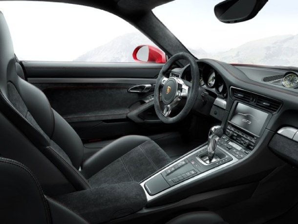 Im Innenraum dominiert griffiges und pflegeleichtes Alcantara. Sowohl das Lenkrad als auch die Türverkleidungen und Sitzmittelbahnen sind mit dem leichten Material überzogen. Wie schon bei den Vorgängern kann der Kunde auch Schalensitze, Überrollbügel und 4-Punkt-Gurte bestellen. Allein die superleichten Sitze aus dem Carrera GT sind nicht mehr erhältlich. Zur Ermittlung und Analyse der Rundenzeiten empfiehlt sich das optionale Sport Chrono Paket.