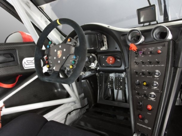 Das Cockpit mit Armaturenbrett und Mittelkonsole aus Carbon bietet alles, was ein Rennfahrer während der Ausdauerrennen benötigt. Die sechs Gänge des Renngetriebes werden über Schaltwippen gewechselt.