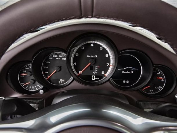 Das digitale Display im unteren Bereich des mittleren Rundinstruments macht bei freier Fahrt erst bei 315 (Turbo), beziehungsweise 318 km/h halt. Der Tempozuwachs dazwischen ist beeindruckend.