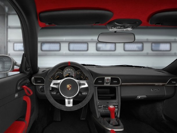 Im Interieur fällt direkt das serienmäßig verbaute Clubsport-Paket mit eingeschweißtem Überrollkäfig ins Auge. Der Fahrer kann sich in seinem Leichtbau-Schalensitz beim Betrieb des Fahrzeugs auf einer Rennstrecke mit einem beigelegten Sechspunktgurt festschnallen und hat für alle Fälle einen Feuerlöscher mit an Bord. Alle Teile, zu denen er Griffkontakt während der Fahrt aufbauen muss – also Lenkrad, Schalt- und Handbremshebel – sind mit widerstandsfähigem Alcantara überzogen, das wahlweise in schwarz oder rot erhältlich ist. Ebenso die Armauflagen der Türen, die Sitzmittelbahnen, der Dachhimmel und das Ablagefach in der Mittelkonsole. Um das Motorsport-Thema aufzugreifen bestehen die Dekorleisten am Armaturenbrett und die Einstiegsblenden mit „RS 4.0“-Schriftzug in Sichtcarbon gehalten. Auf dem Handschuhfachdeckel sitzt eine Metallplakette, die dem Besitzer mitteilt, welchen der auf 600 Exemplare limitierten 997 GT3 RS 4.0 er sein Eigentum nennen darf.