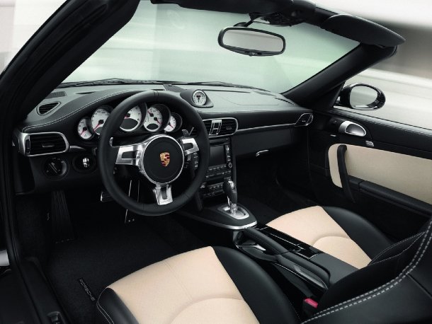Dynamische Kurvenlichter, RS-Spyder-Leichtmetallfelgen mit Zentralverschluss in 19 Zoll, das Dreispeichen-Sportlenkrad mit Schaltpaddles, adaptive Sportsitze, ein Tempomat und ein CD-/DVD-Wechsler vervollständigen im Zusammenspiel mit exklusiv für den Turbo S angebotenem Bicolor-Leder in den Farbkombinationen schwarz-crema oder schwarz-titanblau die umfangreiche Serienausstattung des Porsche 997 Turbo S, die ansonsten auf der sowieso schon guten Ausstattung des normalen Turbo basiert.