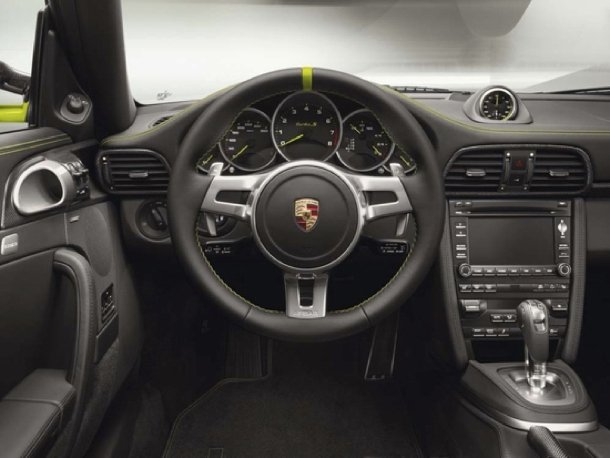 Im Innenraum findet sich Acidgrün als Nullstellenmarkierung des Lenkrads, als Ziernaht, als Keder an den Sitzen und als eingestickter „Edition 918 Spyder“-Schriftzug auf den Kopfstützen. Auch die Zeiger der Instrumentierung erhalten die besondere Farbe, die sich erstmals am 918 Spyder Concept vor einem Jahr fand. Das serienmäßige PCM verfügt über einen eigenständigen Startbildschirm. Zum weiteren Serienumfang gegenüber dem normalen Turbo S zählt das erweiterte Lederpaket, das Porsche Doppelkupplungsgetriebe PDK, Dekorblenden in Sichtcarbon und das Sport Chrono Paket Plus. Auf der Beifahrerseite findet sich die von anderen Porsche-Sondermodellen bereits bekannte Limitierungsplakette, die wie erwähnt bei Bestellung eines 918 Spyder die selbe laufende Nummer trägt.