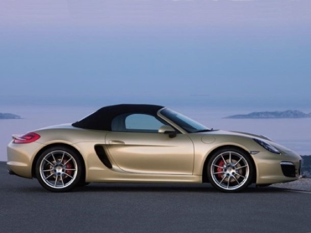All das verpackt Porsche in eine neue Karosserie, die zwar unzweifelhaft die Verwandtschaft zur ersten und zweiten Boxster-Generation klarstellt, aber auch neue Elemente einbringt. Auffällig ist zum Beispiel der Heckspoiler, der sich seitlich bis in die Heckleuchten fortsetzt. Das Flügelelement zwischen den Leuchten fährt ab einer Geschwindigkeit von 120 km/h ein Stück weit aus und senkt somit wirksam den Auftrieb an der Hinterachse ab. Die geduckte Grundform mit großen Lufteinlässen an der Front und in den Seiten, sowie der flach stehenden Windschutzscheibe rezitieren sowohl die Vorgänger, als auch den letzten Porsche-Supersportler, den Carrera GT. Der Boxster S ist wahlweise in 14 Lackfarben zu haben und ist mit einem besonders leichten Stoffverdeck ausgestattet, in dem Magnesiumplatten für mehr Steifigkeit verbaut sind. Es kann in 9 Sekunden geöffnet oder geschlossen werden – auch während der Fahrt bis Tempo 50 oder im Stand bequem per Schlüsselfernbedienung.