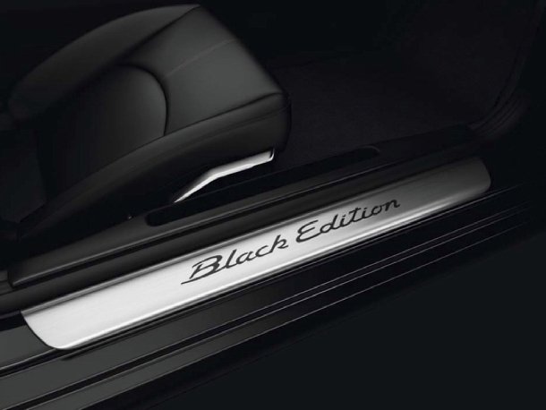 Wenn schon das Exterieur komplett schwarz ist, darf der Innenraum natürlich nicht zurückstecken. Vom serienmäßigen Sport-Lederlenkrad über die Zierblenden bis hin zu den Zifferblättern ist alles in der Black Edition auch wirklich black, pardon, schwarz. In den Kopfstützen der Sitze ist das Porsche-Logo eingeprägt und auf dem Armaturenfachdeckel ist eine Plakette mit der Limitierungsnummer angebracht.