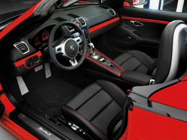 Innen wird schwarzes Leder mit roten Kontrastnähten kombiniert. Auch an den Sicherheitsgurten und den Dekorblenden findet sich die Außenfarbe wieder. Auf der Abdeckung vor den Becherhaltern, die oberhalb des Handschuhfaches herausklappen, befindet sich der Schriftzug „Boxster S personally built for 7“, der ebenfalls auf den Edelstahleinstiegsleisten auflackiert wird. Zum Lieferumfang zählt auch ein Schlüssel in Fahrzeugform, der ebenfalls Indischrot trägt und in einem passgenauen Lederetui untergebracht werden kann. Für die Zeit, in der das Boxster S Sondermodell in der Garage abgestellt wird, gibt es ein rot-weißes Tuch zum überziehen.