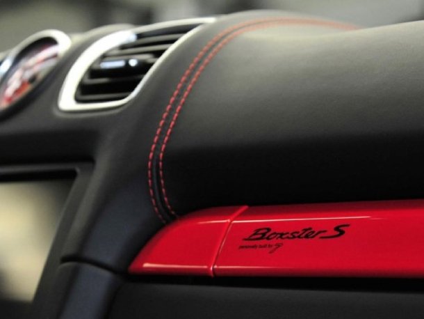 Innen wird schwarzes Leder mit roten Kontrastnähten kombiniert. Auch an den Sicherheitsgurten und den Dekorblenden findet sich die Außenfarbe wieder. Auf der Abdeckung vor den Becherhaltern, die oberhalb des Handschuhfaches herausklappen, befindet sich der Schriftzug „Boxster S personally built for 7“, der ebenfalls auf den Edelstahleinstiegsleisten auflackiert wird. Zum Lieferumfang zählt auch ein Schlüssel in Fahrzeugform, der ebenfalls Indischrot trägt und in einem passgenauen Lederetui untergebracht werden kann. Für die Zeit, in der das Boxster S Sondermodell in der Garage abgestellt wird, gibt es ein rot-weißes Tuch zum überziehen.