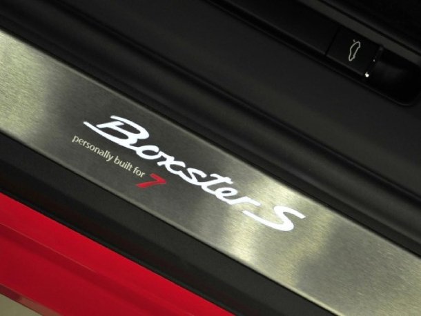 Innen wird schwarzes Leder mit roten Kontrastnähten kombiniert. Auch an den Sicherheitsgurten und den Dekorblenden findet sich die Außenfarbe wieder. Auf der Abdeckung vor den Becherhaltern, die oberhalb des Handschuhfaches herausklappen, befindet sich der Schriftzug „Boxster S personally built for 7“, der ebenfalls auf den Edelstahleinstiegsleisten auflackiert wird. Zum Lieferumfang zählt auch ein Schlüssel in Fahrzeugform, der ebenfalls Indischrot trägt und in einem passgenauen Lederetui untergebracht werden kann. Für die Zeit, in der das Boxster S Sondermodell in der Garage abgestellt wird, gibt es ein rot-weißes Tuch zum überziehen.