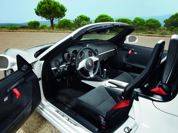 Die Höchstgeschwindigkeit von 267 km/h kann und darf also nur offen erreicht werden. Beschleunigen kann der Boxster Spyder auch, zum Beispiel in 4,8 Sekunden aus der Tiefgarage auf 100 km/h. Möglich macht dies das optionale Porsche Doppelkupplungs-Getriebe (PDK) in Verbindung mit dem Sport Chrono-Paket und einer Launch Control. Der Boxster S Motor bekommt im Spyder einen Aufschlag von 10 PS und leistet somit nun 235 kW/320 PS. Dank Benzindirekteinspritzung liegt der Durchschnittsverbrauch bei 9,3 Litern, was auch durch das abgesenkte Gesamtgewicht von 1.275 Kilogramm möglich wird. Dazu wurde der Schwerpunkt deutlich abgesenkt und ein neues Sportfahrwerk verbaut, welches dem Boxster Spyder noch mehr Fahrdynamik ermöglicht.